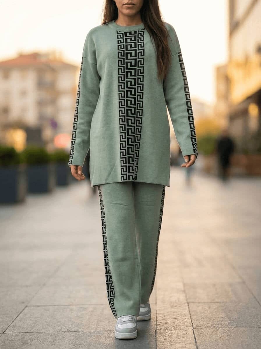 Grey Drop-Shoulder Puzzle Printed Sweat Style 2-Pcs Winter Tracksuit✨ Key Features: